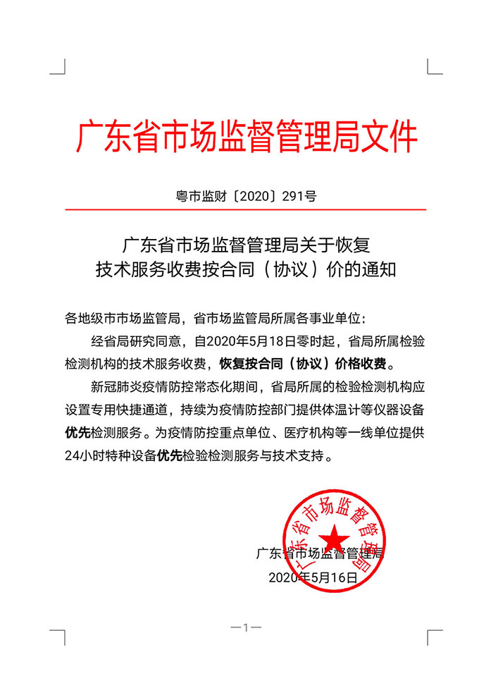 广东省市场监督管理局关于恢复技术服务收费按合同(协议)价的通知